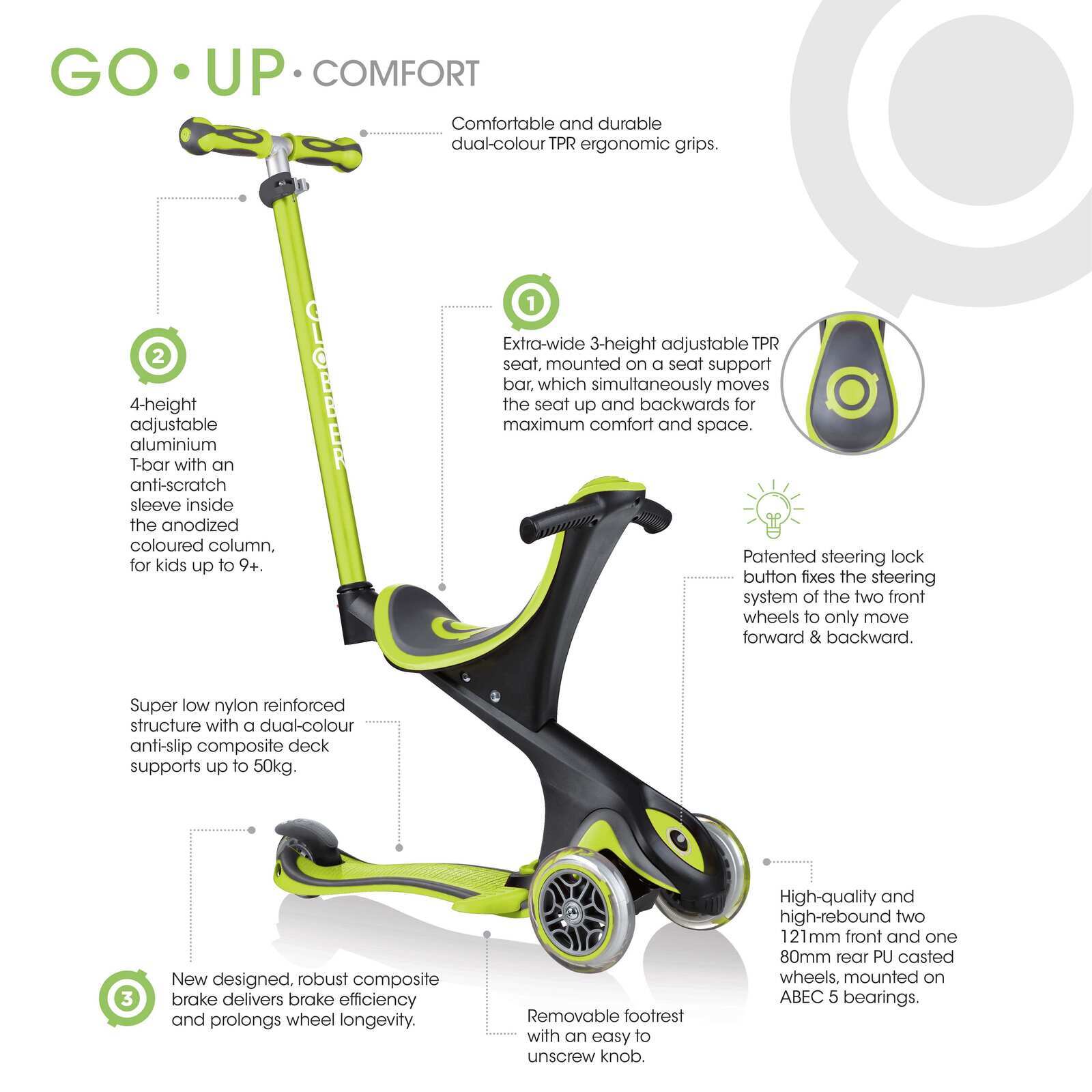 ADJUSTABLE SCOOTER WITH SEAT |3-height adjustable seat (32.5 / 33.5 / 34.5cm from the ground to the top center of the seat) with soft TPR| which moves upwards and backwards simultaneously| thanks to the seat support bar| to offer more space for your little one’s legs as your toddler grows. GO•UP COMFORT also comes with a 4-height adjustable scooter T-bar (67.5 / 72.5 / 77.5 / 82.5cm from the ground) with comfortable dual-color TPR handlebar grips and an easy-to-use clamp.
